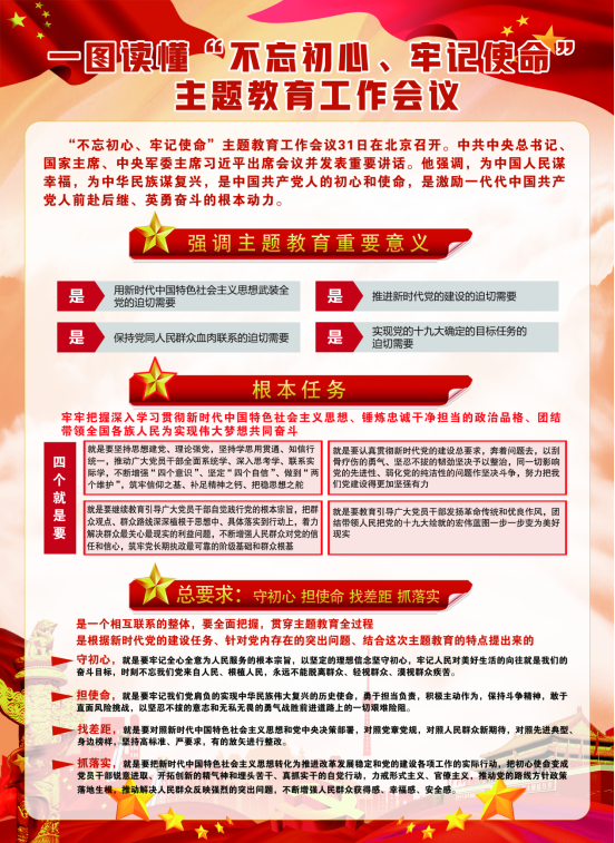 由集團(tuán)黨委副書記、總經(jīng)理劉玲同志宣讀《集團(tuán)黨委開展"不忘初心、牢記使命"主題教育實施方案》。集團(tuán)黨委書記、董事長王玉輝同志作了"不忘初心、牢記使命"主題教育動員講話,對集團(tuán)系統(tǒng)開展主題教育工作進(jìn)行了安排部署,要求把主題教育與完成本單位轉(zhuǎn)型升級、項目建設(shè)、生產(chǎn)經(jīng)營等工作任務(wù)結(jié)合起來,切實把主題教育成果轉(zhuǎn)化為企業(yè)發(fā)展的強(qiáng)大動力,推動青海物產(chǎn)高質(zhì)量發(fā)展。省委"不忘初心、牢記使命"主題教育第十二巡回指導(dǎo)組組長任正德同志做了指導(dǎo)講話。充分肯定了集團(tuán)黨委的前期工作,認(rèn)為會議準(zhǔn)備比較充分,有效統(tǒng)一了干部職工的思想,制定的主題教育《實施方案》操作性強(qiáng),目標(biāo)任務(wù)具體,動員講話政治站位高,思想認(rèn)識深,工作思路清晰。同時,結(jié)合工作組的職責(zé)就落實主題教育各項任務(wù)講了六點意見。一是聚焦根本任務(wù);二是把握"十二"字總要求;三是緊扣"五句話"總目標(biāo);四是落實"四個貫穿";五是抓實"六項重點"舉措;六是力戒形式主義,嚴(yán)禁主題教育走形式、走過場。
