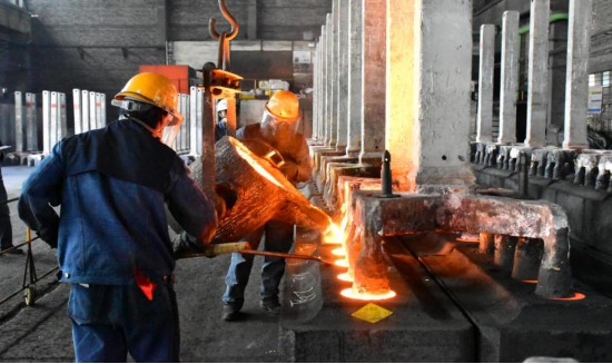 鏡頭一:陽極組裝車間"磷生鐵澆筑"比賽現(xiàn)場(chǎng),參賽選手在指揮員的指令下,天車工密切配合,將赤紅的磷鐵水均勻澆筑在炭碗內(nèi)側(cè),整個(gè)過程"有條不紊、一氣呵成"。