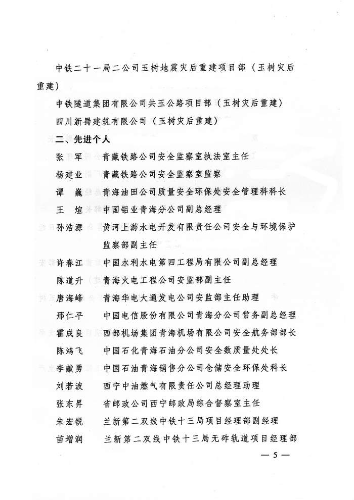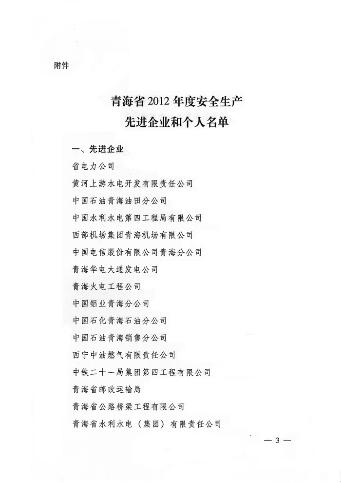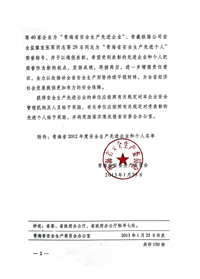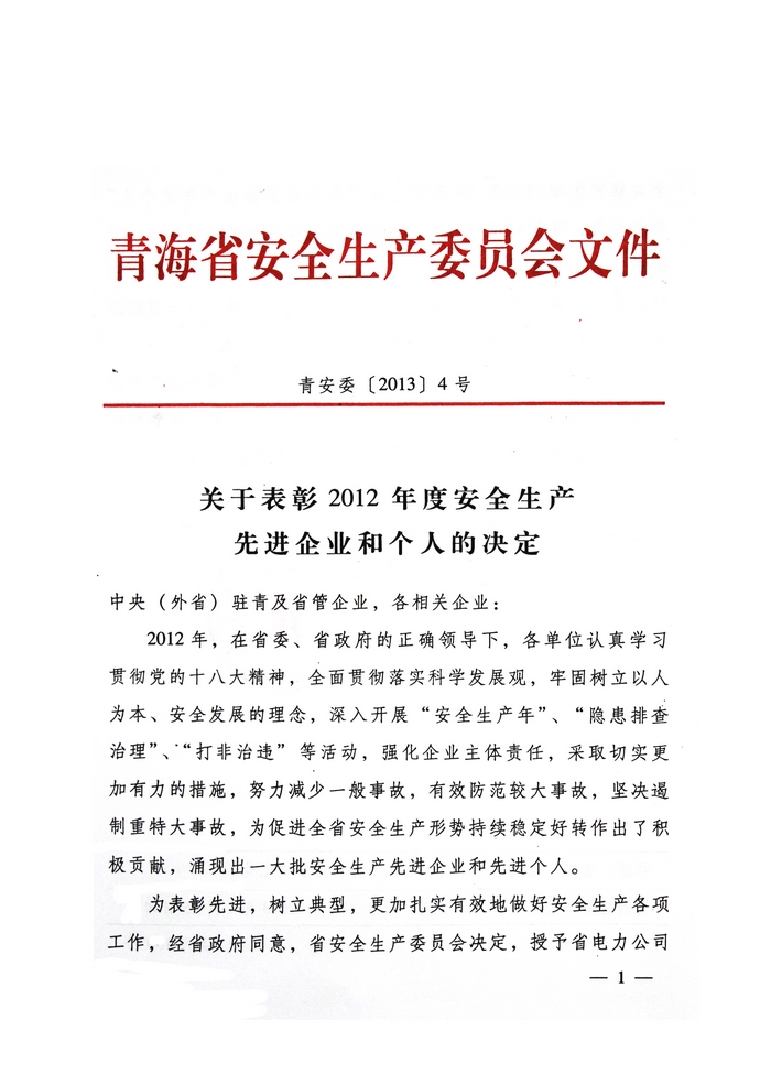 2012年,在省委、省政府的正確領(lǐng)導(dǎo)下,青海省物產(chǎn)集團(tuán)總公司認(rèn)真學(xué)習(xí)貫徹黨的十八大精神,全面貫徹落實科學(xué)發(fā)展觀,牢固樹立以人為本、安全發(fā)展的理念,深入開展"安全生產(chǎn)年"、"隱患排查治理"、"打非治違"等活動,為促進(jìn)全省安全生產(chǎn)形勢持續(xù)穩(wěn)定好轉(zhuǎn)做出了積極貢獻(xiàn)。為此,經(jīng)省政府同意,省安全生產(chǎn)委員會決定授予青海省物產(chǎn)集團(tuán)總公司"2012年度安全生產(chǎn)先進(jìn)企業(yè)"榮譽(yù)稱號。